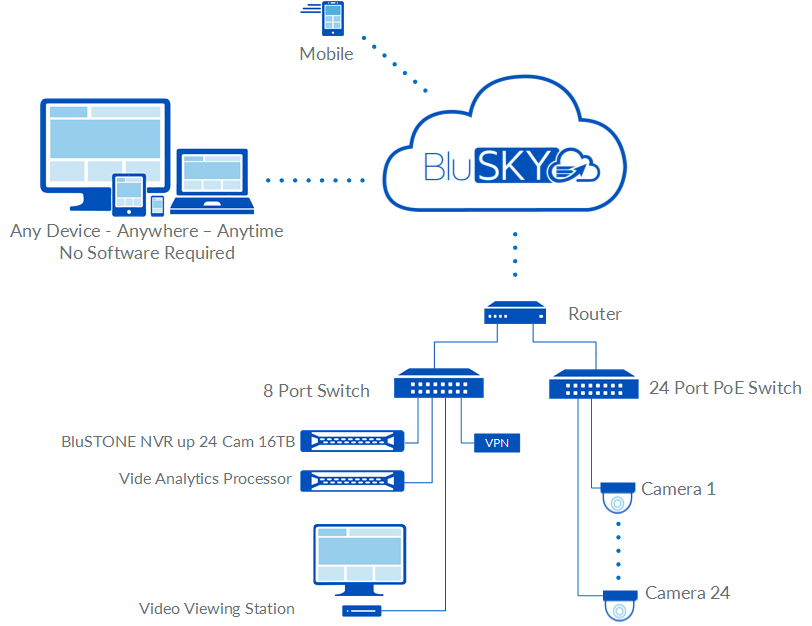 | 817-0660 | Local Video | Connection of one (1) camera to any BluSTONE(local) NVR for recording video. Includes camera configuration and video events in BluSKY. No video is sent to BluSKY, or available for playback in BluSKY. | per Camera | Included | 24 | $99.78 | $2,395 |