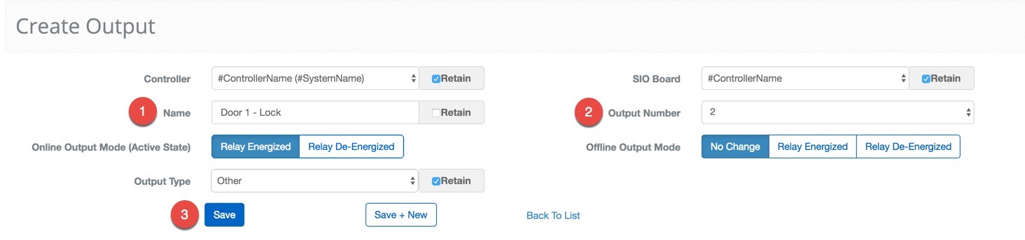 Now to configure the second doors Output. All of the settings will stay the same except the Output Number and Name, coincidentally only the fields that do not have the Retain box checked by default.